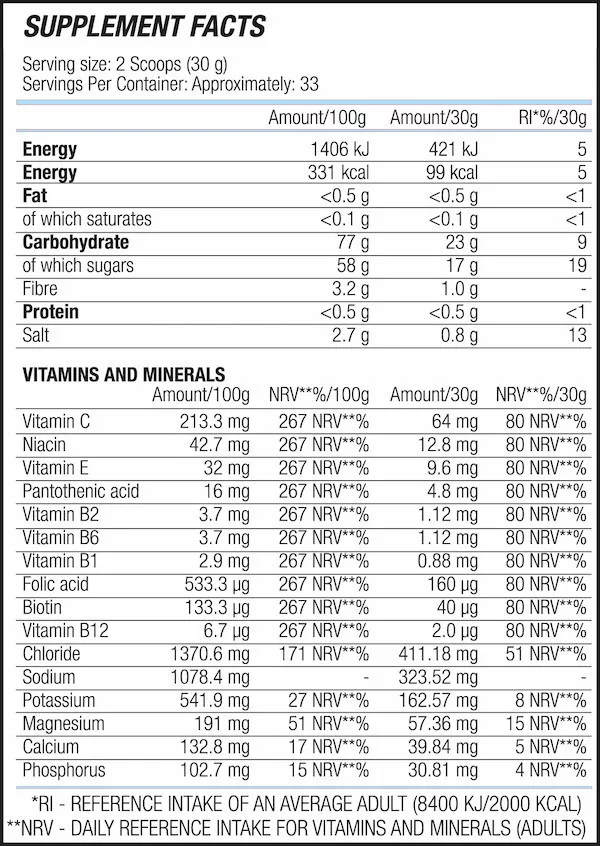 szénhidrát komplex (karbo-lyn ™ (homopoliszacharid*), palatinóz, fruktóz, dextróz), étkezési rost (inulin), étkezési sav (citromsav), ásványi anyagok (klorid: nátrium-klorid, kálium-klorid; nátrium: nátrium-citrát, nátrium-klorid; kálium: káliumklorid; magnézium: magnézium-laktát; kalcium: kalcium ortofoszforsavval alkotott sói, foszfor: kalcium ortofoszforsavval alkotott sói), aroma, csomósodást gátló anyag (kalcium-foszfátok), vitaminok (C-vitamin: L-aszkorbinsav; niacin: nikotinamid; E-vitamin: DL-alfa-tokoferil-acetát; pantoténsav: kalcium-D-pantotenát; B2-vitamin: riboflavin-5′-foszfát, B6-vitamin: piridoxin-hidroklorid; B1-vitamin: tiamin-hidroklorid; folsav: pteroil-monoglutaminsav; biotin: D-biotin; B12-vitamin: ciano-kobalamin), színezék (karotinok), édesítőszer (szukralóz).