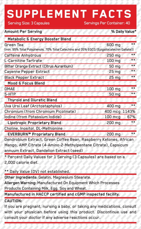 EverBuild Nutrition – EVER BURN / 120 kapszula – étrend-kiegészítő adag: 3 kapszula; adagok dobozonként: 40 adag; Mennyiség adagonként / % napi érték(NRV) : zöld tea:600mg/**; vízmentes koffein:250mg/**; L-karnitin tartarát: 100mg/**; keserű narancs kivonat: 50mg/**; cayenne bors kivonat: 25mg/**; feketebors kivonat: 25mg/**; DMAE: 100mg/**; 5-htp: 50mg/**; uva ursi levél:400mg/**; króm (krómium pikolinát):400mcg/1143%; jód (potassium iodine):100 mcg/67%; „Lipotropic Proprietarí Blend”: 200mg/**; (dendrobium kivonat, zöld kávébab, málna ketonok, afrikai mangó, AMP citrát(4-amino 2-methylpentate citrát), capsicum annuum kivonat, pitypang kivonat (mag)) *; Százalékos napi érték 1 adag (3 kapszula) 2000 kalóriás étrenden alapulnak. ** Napi érték (NRV) nincs meghatározva. Egyéb összetevők: zselatin, magnézium-sztearát. Allergén figyelmeztetés: szóját, tojást és diót felhasználó létesítményben készült Figyelem: Az ajánlott napi fogyasztási mennyiséget ne lépje túl! A termék nem helyettesíti a változatos étrendet és a kiegyensúlyozott életmódot! Minőségét megőrzi: (nap/hó/év) lásd a doboz tetején jelzett időpontig. Tárolási feltételek: 5°C és 30°C közötti hőmérsékleten, közvetlen hőtől, napfénytől és nedvességtől védett helyen, gyermekektől elzárva tárolandó!
