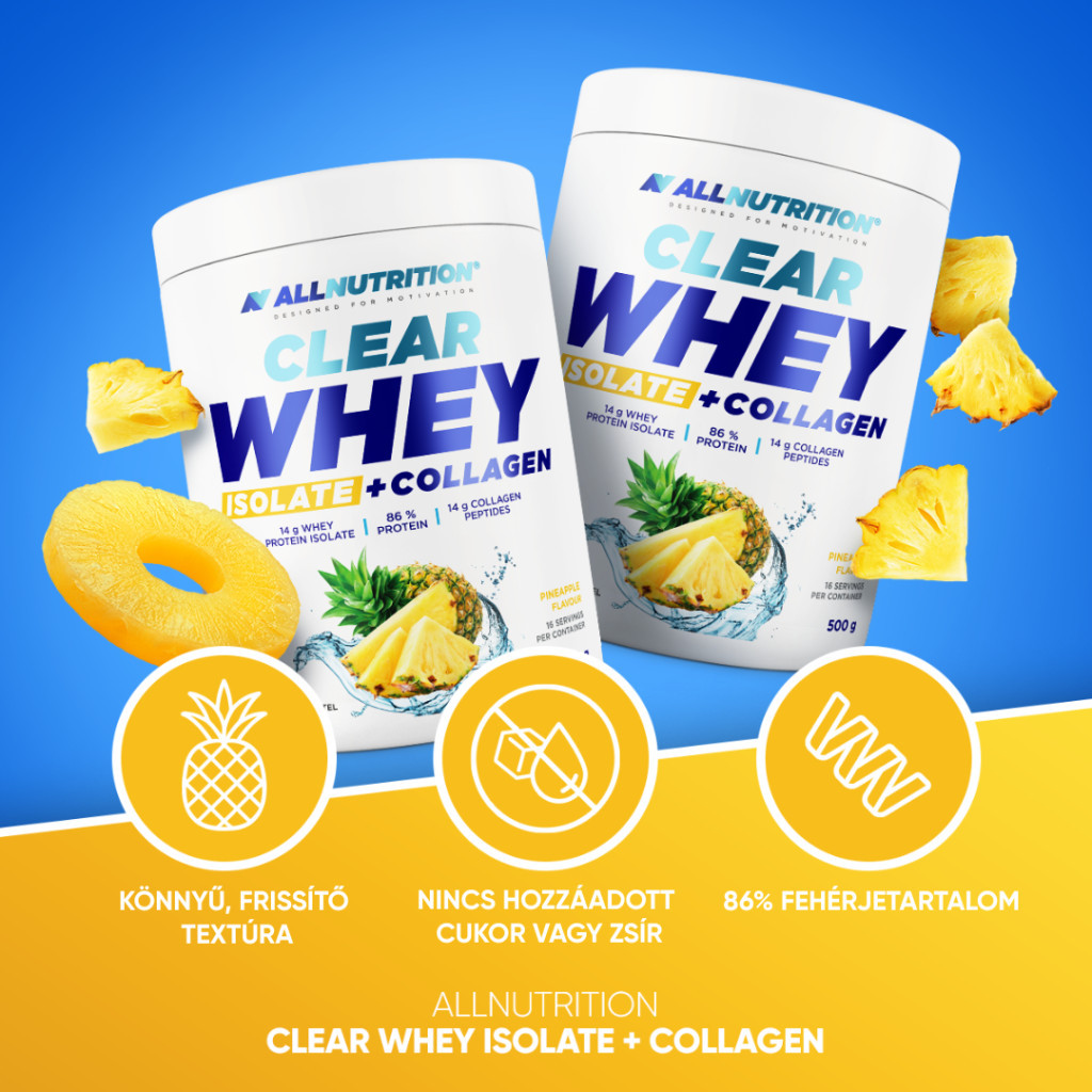 ALLNUTRITION CLEAR WHEY ISOLATE + COLLAGEN egy kiváló minőségű, por formájú étrend-kiegészítő, amely újradefiniálja a fehérjeitalokhoz való hozzáállást. Felejtsd el a sűrű, tejes turmixokat! Ez a termék vízben feloldva finom, könnyed, gyümölcsös ízű itallá válik. A tejsavóprotein-izolátum (WPI) és a hidrolizált kollagén egyedi kombinációjának köszönhetően erős adag proteint biztosít a szervezetnek, támogatva az alakformáló célokat.