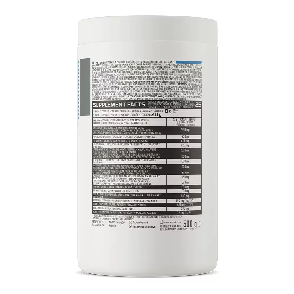 -Az izomszövet regenerálása és újjáépítése -Az edzés utáni anabolikus folyamatok maximalizálása -Az edzés utáni kimerültség és fáradtság csökkentése -Olyan összetétel, amely táplálja, hidratálja és biztosítja a szükséges számú elektrolitot -Rövidített regenerációs idő Adagok a csomagban: 25 adag Adag: 20g/adag % ZDS * Tartalom 100 g-ban, 20 g% RWS adagban Elágazó láncú aminosavak 12,5 g 2 500 mg * L-leucin 6,25 g 1 250 mg * 3,13 g L-valin 625 mg * 3,13 g L-izoleucin 625 mg * Citrullin malát 10 g 2000 mg * beleértve 6,5 g l-citrulint 1300 mg * L-glutamin 7,5 g 1500 mg * Kreatin-monohidrát 7,25 g 1450 mg * ebből 6,38 g 1276 mg kreatin * Kreatin-malát 7,25 g 1450 mg * ebből 5,37 g 1073 mg kreatin * Taurin 5 g 1000 mg * Glicin 5 g 1000 mg * Béta-alanin 4 g 800 mg * C-vitamin 2 500 mg 500 mg 625% Kálium 1 500 mg 300 mg 15% Nátrium 1000 mg 200 mg * Magnézium 285 mg 57 mg 15%