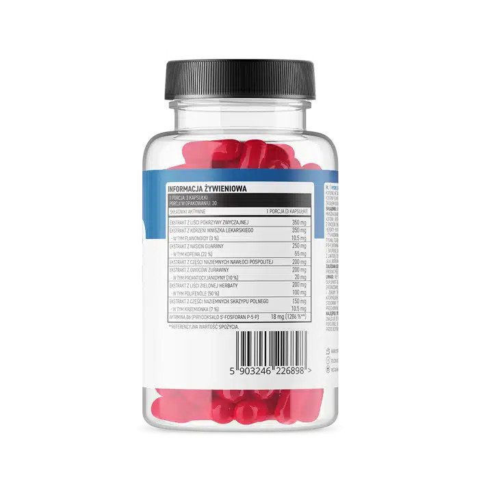 Csalánlevél-kivonat, pitypanggyökér-kivonat - 3% flavonoid, guarana mag kivonat - 22% koffein, solidago virgaurea kivonat, tőzegáfonya-kivonat - 10% proantocianidin, zöldtea levél kivonat - 50% polifenol, mezei zsurló kivonat - 7% szilícium-dioxid, kapszulahéj (zselatin, víz, festék: titán-dioxid, vas(III)-oxid, azorubin*), piridoxál-5-foszfát P-5-P (B6-vitamin). *az azorubin a gyermekek tevékenységére és figyelmére káros hatást gyakorolhat.