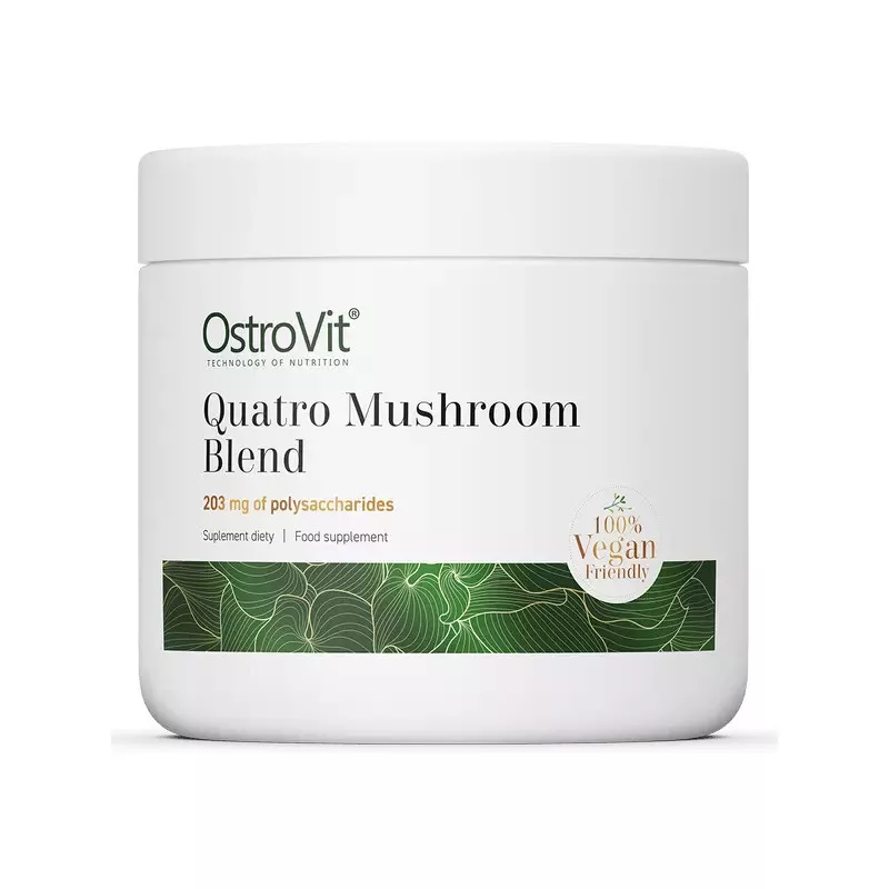 Az OstroVit Quatro Mushroom Blend négy ázsiai gomba kivonatának egyedülálló kombinációja: Reishi (pecsétviaszgomba), Lion’s mane (süngomba), Cordyceps és Chaga.