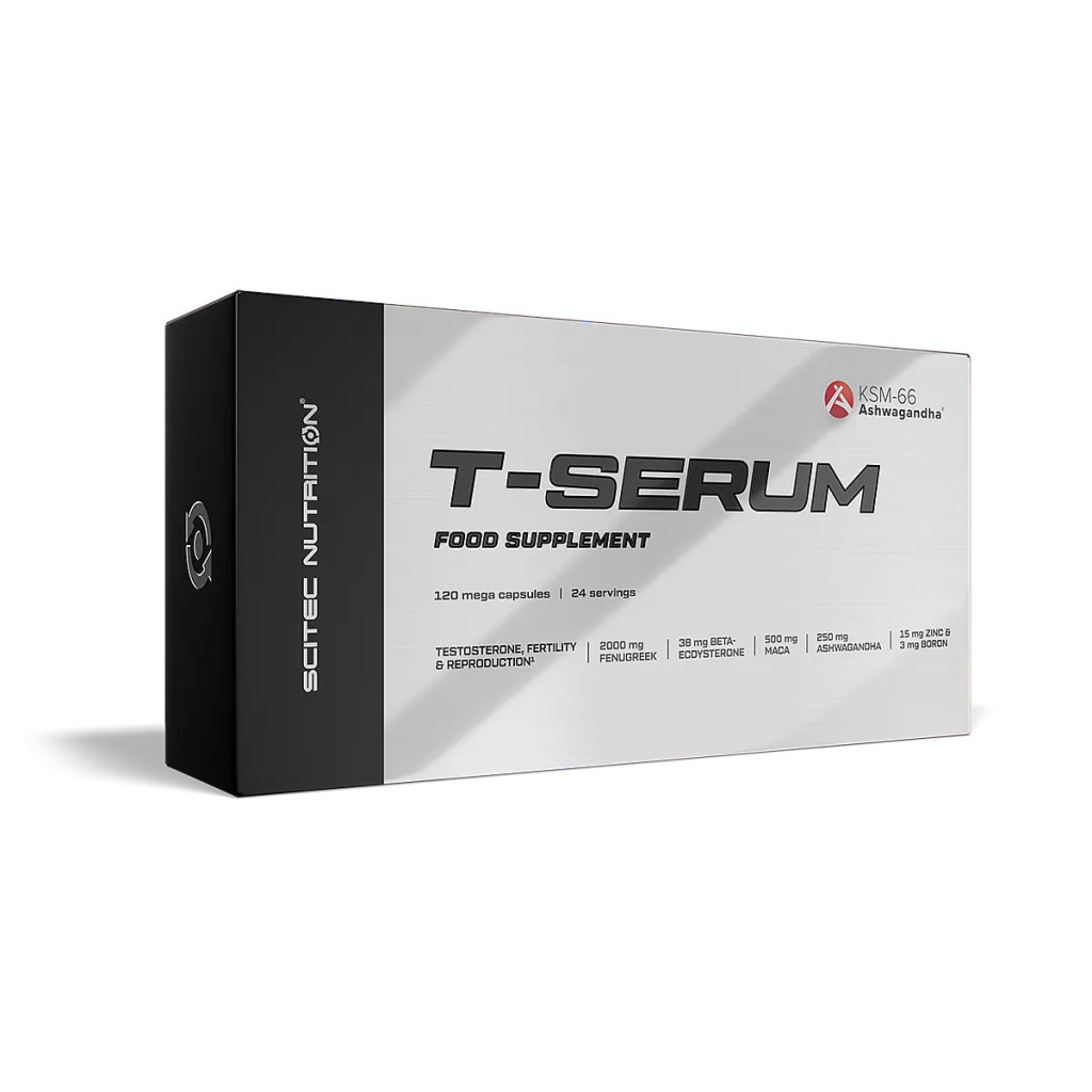 A T-Serum egy 6 összetevős hormonoptimalizáló komplex. A már jól ismert növényi hatóanyagok kivonata mellett, mint a Fenugreek (görögszéna) mag kivonat, a béta-ekdiszteron spenót levélből kivonva, a trademarkolt KSM-66® Ashwagandha és a Maca kivonat mellett helyet kapott még a cink és a bór is a formulában.