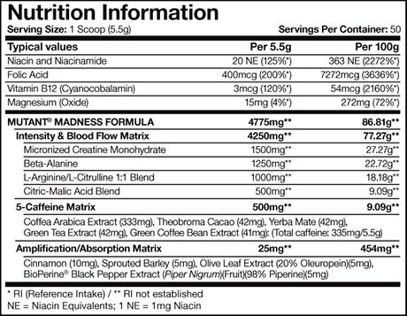 A MUTANT MADNESS új fejezetet nyit az edzés előtti formulák világában! A kőkemény edzésekhez és extrém intenzitáshoz tervezett formula, garantáltan megváltoztatja azt, amit eddig az edzés előtti formulákról gondoltál! Vedd komolyan, olvasd el a teljes termékcímkét és használd felelősséggel, mert ez a legextrémebb formula, amit valaha próbáltál!