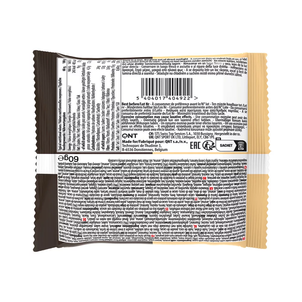 QNT PROTEIN COOKIE. Chocolate Chips. Csokoládé ízű, magas fehérjetartalmú süti csokoládédarabokkal, cukorral. Nettó tömeg: 12 x 60 g (= 720 g). Összetevők: TEJfehérje, barnacukor, növényi glicerin, BÚZAliszt (BÚZAliszt, kalcium-karbonát, vas, niacin, tiamin), hidrolizált BÚZAfehérje, étcsokoládé darabok 9% (kakaómassza, cukor, emulgeálószer: SZÓJAlecitin; aroma), olívaolaj, kókuszolaj, kakaópor, oldható kukoricarost, térfogatnövelő szerek: borkőtejszín, nátrium-bikarbonát; aroma, étkezési só. Tartalmazhat dióféléket és földimogyorót. Átlagos tápérték tartalom 60 g/100 g-ban: Energia: 986 kJ/1643 kJ • Energia: 243 kcal/405 kcal • Zsír: 9 g/15 g • amelyből Telített zsírsavak: 4,3 g/7,2 g • Szénhidrát: 24 g/40 g • amelyből Cukrok: 12 g/19,5 g • Rost: 3,6 g/6g • Fehérje: 15 g/25 g • Só: 0,60 g/1,00 g. Túlzott fogyasztása hashajtó hatású lehet. Hűvös, száraz helyen, közvetlen napsugárzástól távol tárolandó. Gyártási sorozatszám és minőségét megőrzi: ld. a csomagoláson. Forgalmazza: Sport8 Hungary Kft. 1116 Budapest, Fehérvári út 168-178. Hungary, e-mail: info@sport8.hu